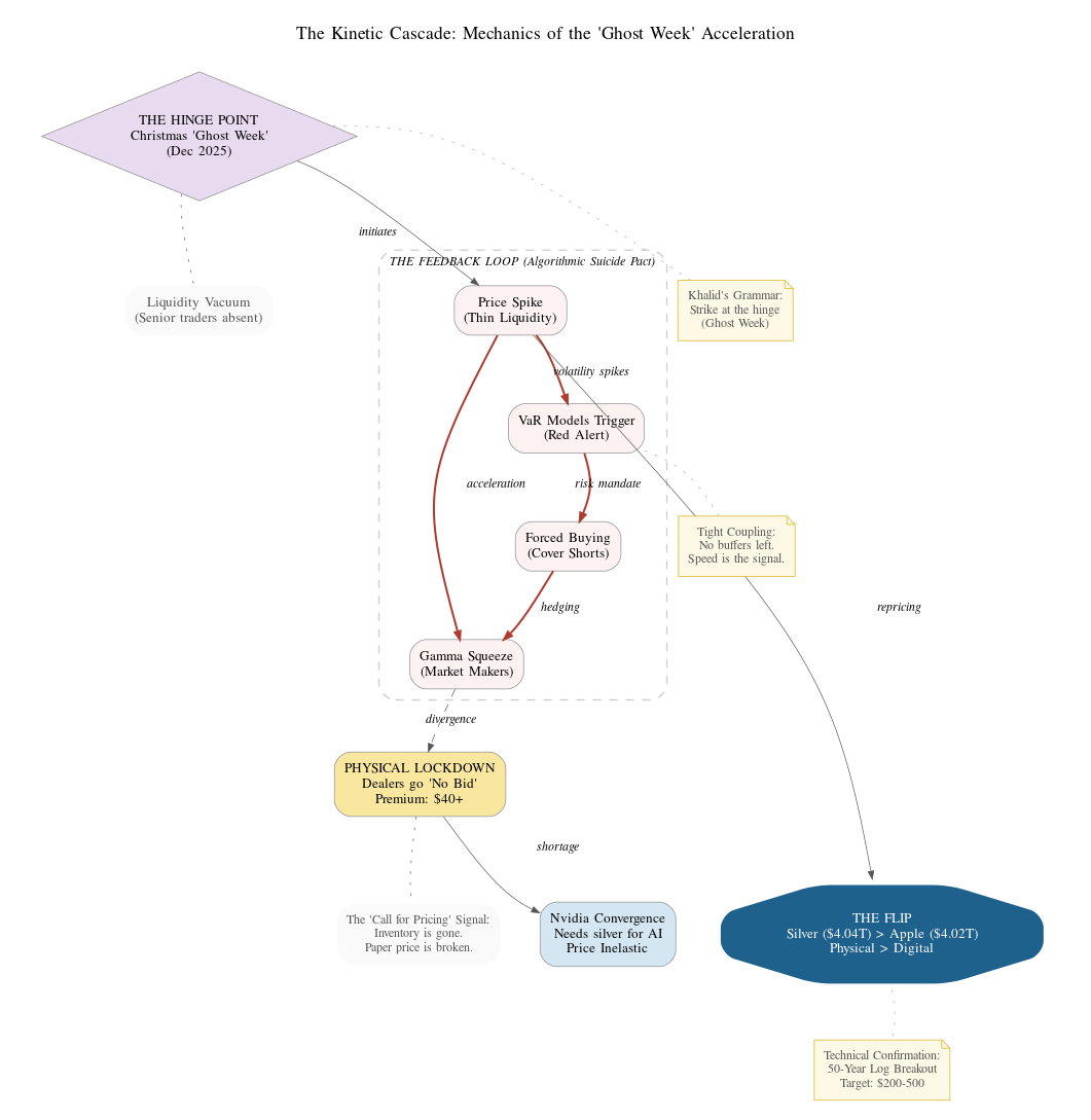 VaR Trigger Cascade: When thin holiday liquidity caused silver to spike, Value-at-Risk models at major banks started flashing red alerts. Junior traders, unable to reach senior management, were forced by protocol to cover short positions immediately. But there were no sellers in the ghost week vacuum.