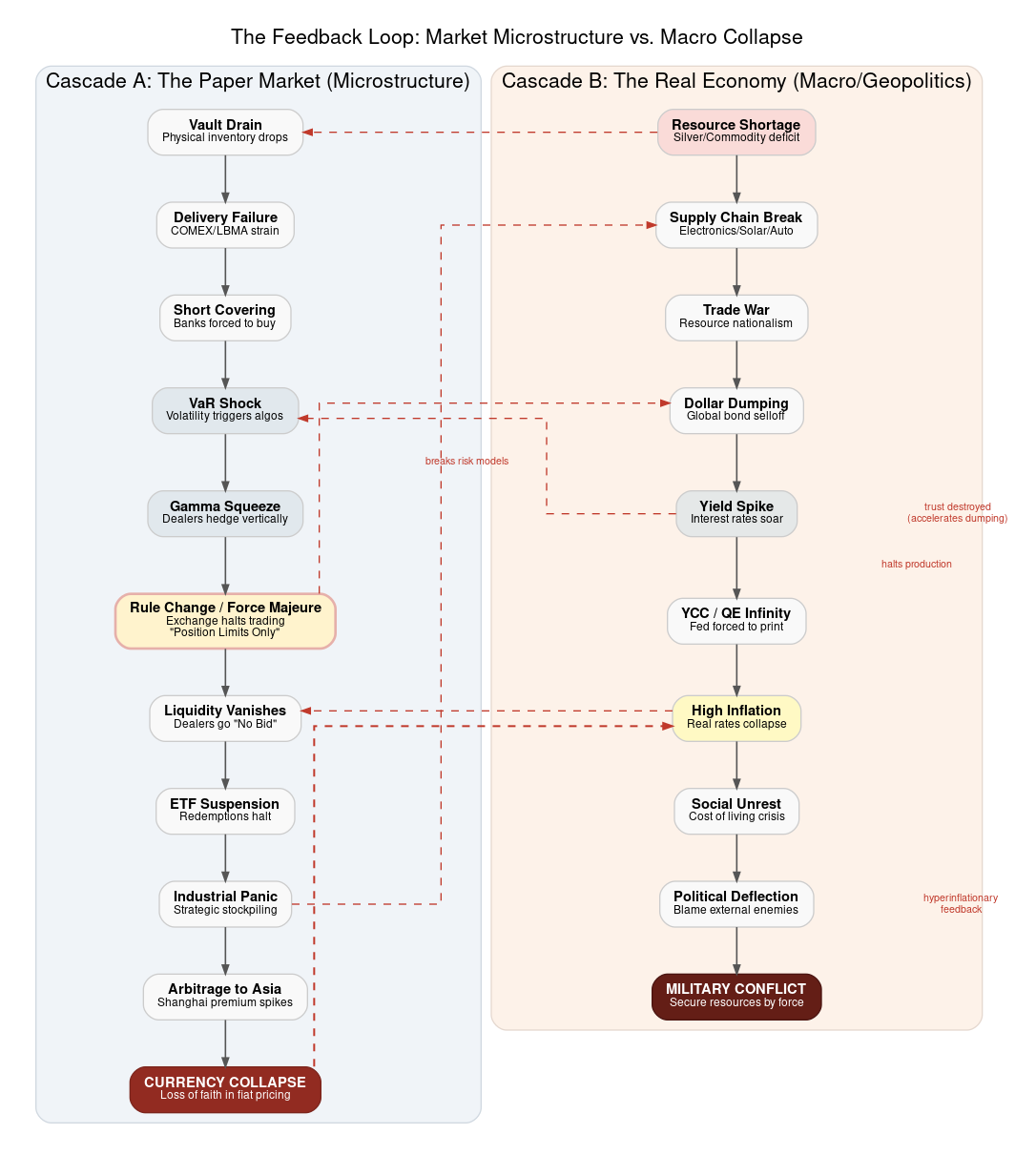 Vault drain → COMEX cannot deliver → Banks forced to cover shorts → VaR models trigger → Gamma squeeze activates → Dealers go “no bid” → ETFs suspend redemptions → Industrial buyers panic → Shanghai arbitrage intensifies → Currency confidence collapses