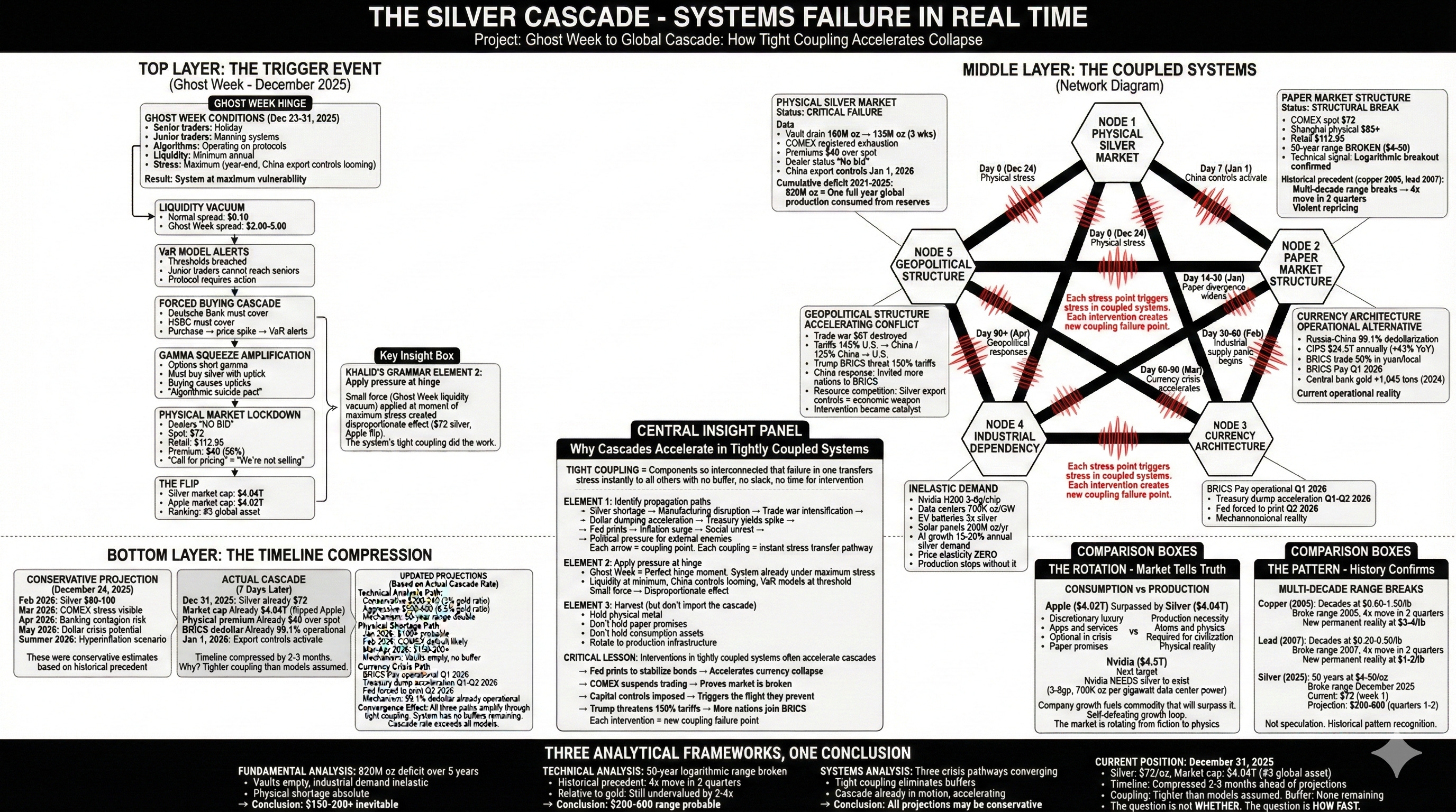 The question each holder needs to answer: do you believe we’re in a normal commodity cycle with typical currency fluctuations, or do you believe we’re watching a fiat currency system break down in real-time through the mathematics of cascade failure in a tightly coupled global financial system where silver shortage, trade war, and currency crisis are three manifestations of one systemic collapse?