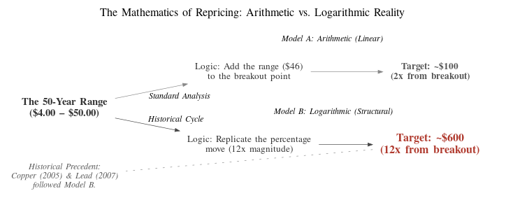 Is this probable? Analysts making this case aren’t claiming certainty. But they’re pointing out that copper and lead both did exactly this when they broke their multi-decade ranges. They didn’t respect arithmetic projections. They followed logarithmic math.