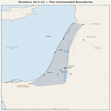 Numbers 34:1-12 tells a different story. The Priestly boundaries are far more constrained: southern border from the Desert of Zin along Wadi el-Arish to the Mediterranean; western border along the coast; northern border from the sea to Mount Hor to Lebo-Hamath to Hazar-Enan; eastern border down through Shepham and Riblah to the eastern shore of the Sea of Galilee, then the Jordan to the Dead Sea. Approximately 160 miles long, 50 miles wide. Roughly the territory of modern Israel, the West Bank, and a strip of southern Lebanon. No Euphrates. No Mesopotamia. No Sinai.